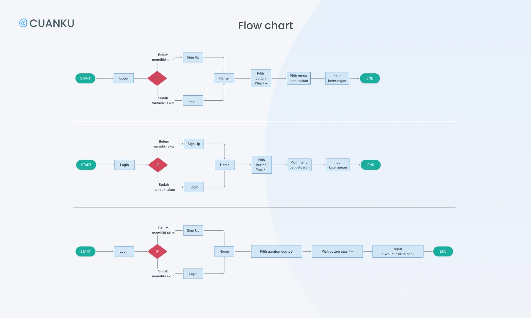 Once we selected the most suitable recommendation due to our MVP, we began to make a user flow chart in whimsical. By doing this, we were able to go through a lot of design ideas and quickly find the right ones. In this step, we just focus on the main feature flow of Cuanku which is adding the transaction so Cuanku can track users’ incomes or expenses.