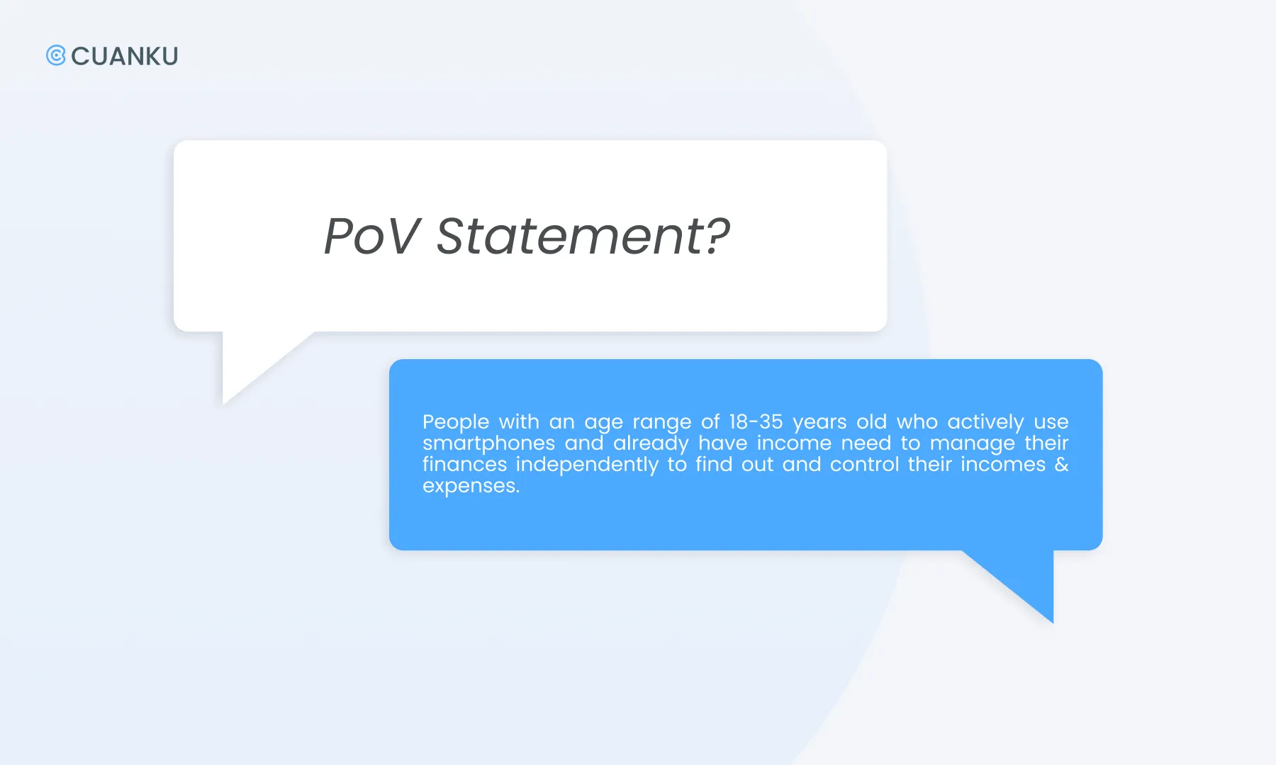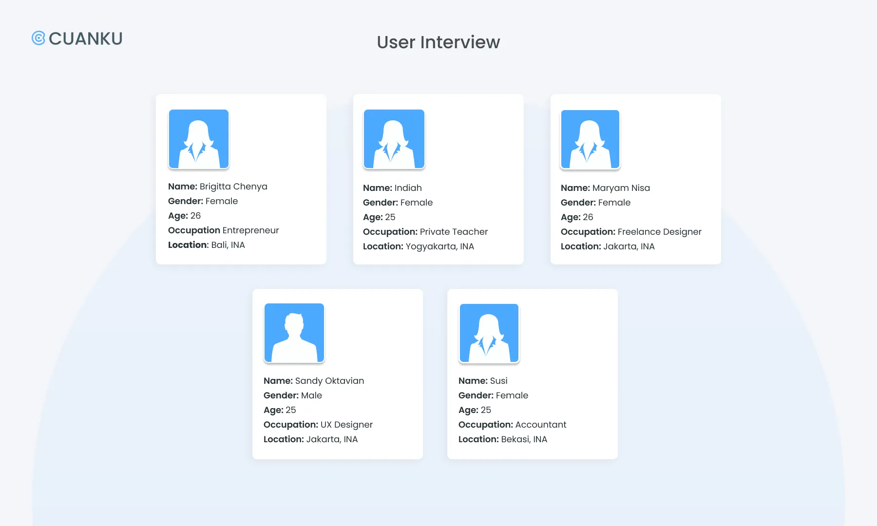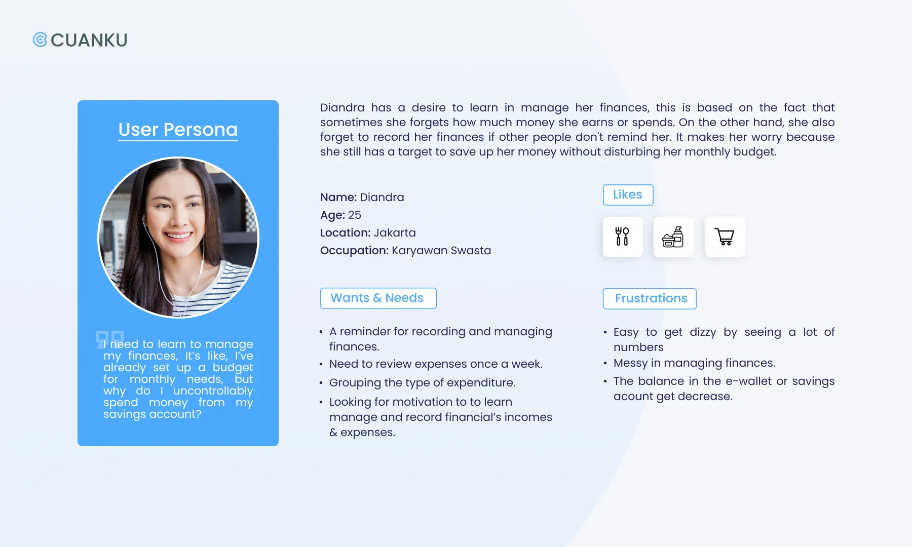 Working on Cuanku was so challenging yet interesting for us since we had to be creative and critical at the same time. Due to this study case, we learned the design thinking process by applying it. In a short period of time, this project made us learn to decide the most effective solution to solve the problem that we researched. Then, without having good coordination in time management, communication and teamwork, this project couldn’t be finished in time.