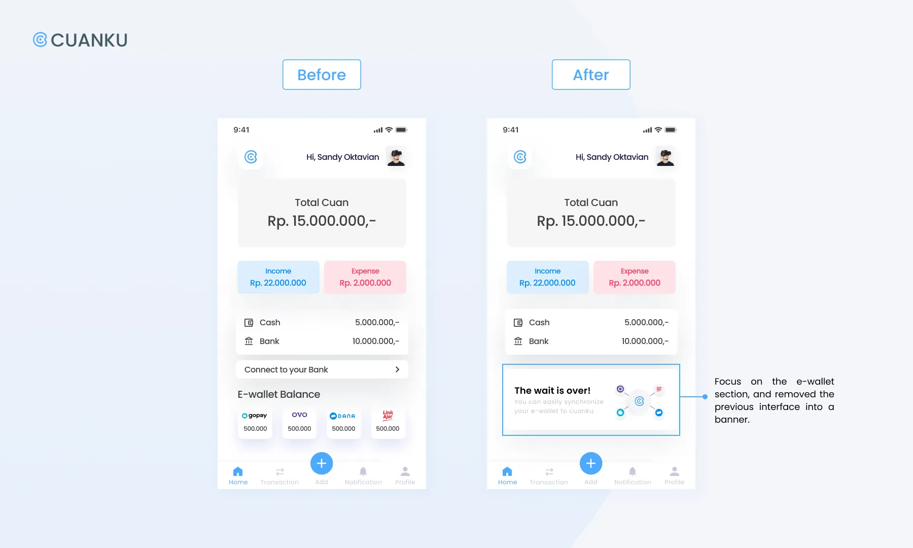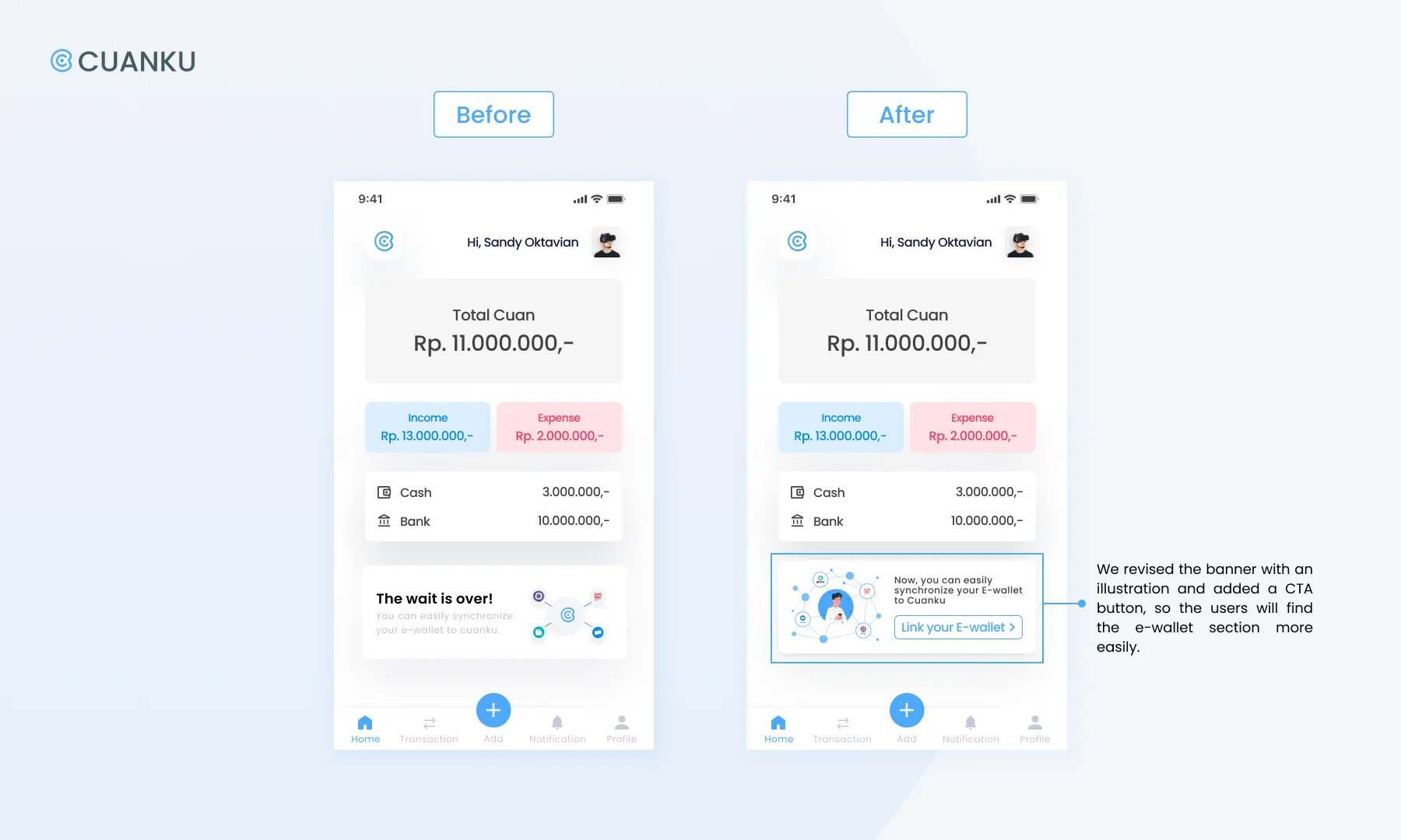 Recommendation: Revise the banner which contains information to help the user connect Cuanku’s prototype with the e-wallet they use by adding a more user-friendly/understandable CTA button.